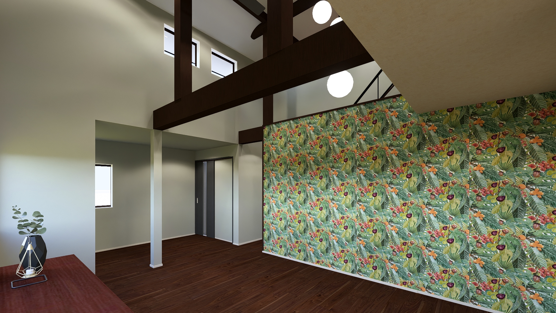階段横の大きな壁には大胆なジャングル柄クロスを採用。